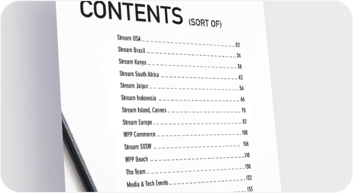 CONTENTS (SORT OF) Stream USA.. .. .. .. .. .. .. .. .. .. .. .. .. .. .. .. .. .. .. .. .. .. .. .. 02 Stream Brazil .. .. .. .. .. .. .. .. .. .. .. .. .. .. .. .. .. .. .. .. .. .. .. 24 Stream Kenya .. .. .. .. .. .. .. .. .. .. .. .. .. .. .. .. .. .. .. .. .. .. .. 36 Stream South Africa .. .. .. .. .. .. .. .. .. .. .. .. .. .. .. .. .. .. .. .. 42 Stream Jaipur.. .. .. .. .. .. .. .. .. .. .. .. .. .. .. .. .. .. .. .. .. .. .. 54 Stream Indonesia .. .. .. .. .. .. .. .. .. .. .. .. .. .. .. .. .. .. .. .. .. 66 Stream Island, Cannes .. .. .. .. .. .. .. .. .. .. .. .. .. .. .. .. .. .. .. 70 Stream Europe . .. .. .. .. .. .. .. .. .. .. .. .. .. .. .. .. .. .. .. .. .. .. 82 WPP Commerce .. .. .. .. .. .. .. .. .. .. .. .. .. .. .. .. .. .. .. .. .. . 100 Stream SXSW .. .. .. .. .. .. .. .. .. .. .. .. .. .. .. .. .. .. .. .. .. .. 106 WPP Beach .. .. .. .. .. .. .. .. .. .. .. .. .. .. .. .. .. .. .. .. .. .. .. ..110 The Team.. .. .. .. .. .. .. .. .. .. .. .. .. .. .. .. .. .. .. .. .. .. .. .. . 130 Media & Tech Events.. .. .. .. .. .. .. .. .. .. .. .. .. .. .. .. .. .. .. . 132 Our Partners ..............................................133 1