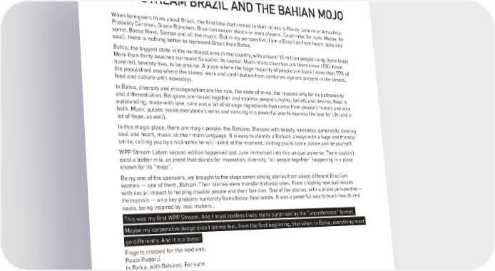 WPP STREAM BRAZIL AND THE BAHIAN MOJO When foreigners think about Brazil, the first idea that comes to their minds is Rio de Janeiro or Amazônia. Probably Carnival, Gisele Bünchen, Brazilian soccer teams or even players. Caipirinha, for sure. Maybe, for some, Bossa Nova, Samba and all the music. But in my perspective (I am a Brazilian from heart, body and soul), there is nothing better to represent Brazil than Bahia. Bahia, the biggest state in the northeast area in the country, with around 15 million people living there today. More than thirty beaches surround Salvador, its capital. Much more churches are there since 1530: three hundred, seventy-two, to be precise. A place where the huge majority of people are black (more than 55% of the population) and where the slaves’ work and contribution from centuries ago are present in the streets, food and culture until nowadays. In Bahia, diversity and miscegenation are the rule, the state of mind, the reasons why for its authenticity and differentiation. Religions are raised together and express people’s myths, beliefs and desires. Food is outstanding, made with love, care and a lot of strange ingredients that come from people’s history and also faith. Music pulses inside everybody’s veins and dancing is a powerful way to express the love for life (and a lot of hope, as well). In this magic place, there are magic people: the Bahians. Blessed with beauty, openness, generosity, dancing soul and heart, music as their main language. It is easy to identify a Bahian: always with a huge and friendly smile, calling you by a nickname he will invent at the moment, inviting you to come, dance and be yourself. WPP Stream Latam second edition happened last June immersed into this unique universe. There couldn’t exist a better mix: an event that stands for innovation, diversity, "all people together" happening in a place known for its "mojo". Being one of the sponsors, we brought to the stage seven strong stories from seven different Brazilian women — one of them, Bahian. Their stories were transformational ones. From creating new businesses with social impact to helping disable people and their families. One of the stories, with a brand perspective — Helmann’s — on a key problem humanity faces today: food waste. It was a powerful way to touch hearts and souls, being inspired by ‘real makers’. This was my first WPP Stream. And I must confess I was really surprised by the "unconference" format.. Maybe my corporative badge didn’t let me feel, from the first beginning, that when in Bahia, everything must. go differently. And it is a bless!. Fingers crossed for the next one, Paula Puppi ;) In Bahia, with Bahians. For sure. 25