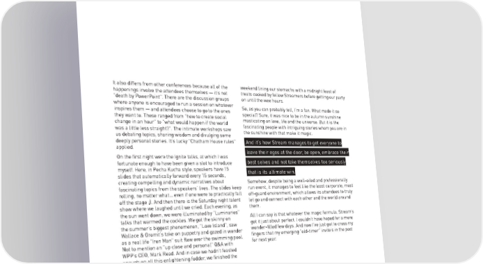 It also differs from other conferences because all of the weekend lining our stomachs with a midnight feast of happenings involve the attendees themselves — it’s not treats cooked by fellow Streamers before getting our party "death by PowerPoint". There are the discussion groups on until the wee hours. where anyone is encouraged to run a session on whatever So, as you can probably tell, I’m a fan. What made it so inspires them — and attendees choose to go to the ones special? Sure, it was nice to be in the autumn sunshine they want to. These ranged from "how to create social masticating on love, life and the universe. But it is the change in an hour" to "what would happen if the world fascinating people with intriguing stories whom you are in was a little less straight?". The intimate workshops saw the sunshine with that make it magic. us debating topics, sharing wisdom and divulging some deeply personal stories. It’s lucky "Chatham House rules" And it’s how Stream manages to get everyone to applied. leave their egos at the door, be open, embrace their On the first night were the Ignite talks, at which I was fortunate enough to have been given a slot to introduce best selves and not take themselves too seriously myself. Here, in Pecha Kucha style, speakers have 15 that is its ultimate win. slides that automatically forward every 15 seconds, creating compelling and dynamic narratives about Somehow, despite being a well-oiled and professionally fascinating topics from the speakers’ lives. The slides keep run event, it manages to feel like the least corporate, most rolling, no matter what… even if one were to practically fall off-guard environment, which allows its attendees to truly off the stage ;). And then there is the Saturday night talent let go and connect with each other and the world around show where we laughed until we cried. Each evening, as them. the sun went down, we were illuminated by "Luminaries" All I can say is that whatever the magic formula, Stream’s talks that warmed the cockles. We got the skinny on got it just about perfect. I couldn’t have hoped for a more the summer’s biggest phenomenon, "Love Island", saw wonder-filled few days. And now I’ve just got to cross my Wallace & Gromit’s take on puppetry and gazed in wonder fingers that my emerging "old-timer" invite’s in the post as a real life "Iron Man" suit flew over the swimming pool. for next year. Not to mention an "up close and personal" Q&A with WPP’s CEO, Mark Read. And in case we hadn’t feasted enough on all this enlightening fodder, we finished the 3