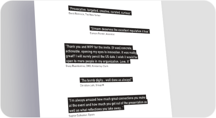 "Provocative, targeted, creative, curated, curious". David Remnick, The New Yorker "Stream deserves the excellent reputation it has". Duncan Painter, Ascential " Thank you and WPP for the invite. [It was] concrete,. actionable, opening my eyes to innovation. It was really. great!! I will surely pencil the US date. I wish it would be. open to more people in my organization. Love. It". Giusy Buonfantino, CMO, Kimberley-Clark "The bomb digity... well done as always!". Christian Juhl, Group M " I’m always amazed how much great connections you make. at the event and how much you get out of the presentation as. well as what reflections you take away...". Sophie Dufouleur, Dyson 73