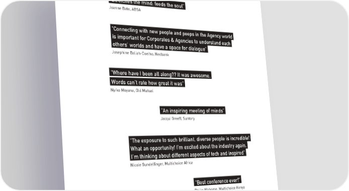 "Stretches the mind; feeds the soul". Joanne Bate, ABSA "Connecting with new people and peeps in the Agency world. is important for Corporates & Agencies to understand each. others' worlds and have a space for dialogue". Josephine Baliah-Coelho, Nedbank "Where have I been all along?? It was awesome.. Words can’t rate how great it was". Nyiko Moyana, Old Mutual "An inspiring meeting of minds". Jacqui Greeff, Suntory "The exposure to such brilliant, diverse people is incredible!. What an opportunity! I’m excited about the industry again.. I’m thinking about different aspects of tech and inspired". Nicole Gundelfinger, Multichoice Africa "Best conference ever!". Philip Wahome, Multichoice Kenya 51