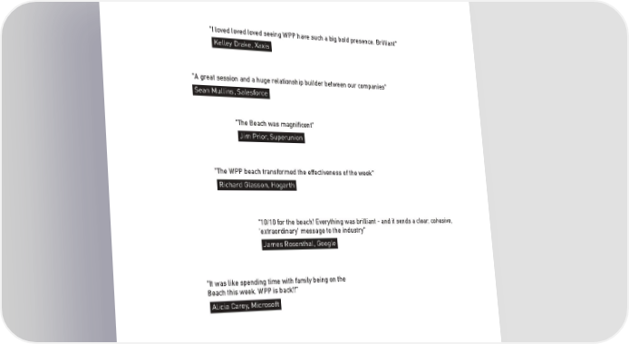 " I loved loved loved seeing WPP have such a big bold presence. Brilliant" Kelley Drake, Xaxis. "A great session and a huge relationship builder between our companies" Sean Mullins, Salesforce. "The Beach was magnificent" Jim Prior, Superunion. "T he WPP beach transformed the effectiveness of the week" Richard Glasson, Hogarth. "10/10 for the beach! Everything was brilliant - and it sends a clear, cohesive, 'extraordinary' message to the industry" James Rosenthal, Google. "It was like spending time with family being on the Beach this week. WPP is back!!" Alicia Carey, Microsoft. 118