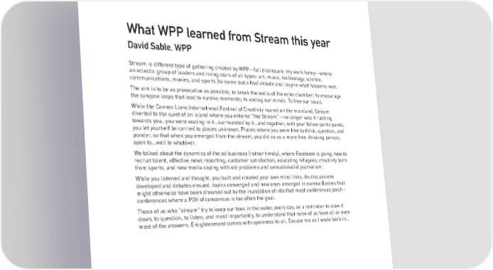 What WPP learned from Stream this year David Sable, WPP Stream is different type of gathering created by WPP—full disclosure: my work home—where an eclectic group of leaders and rising stars of all types: art, music, technology, science, communications, movies, and sports (to name but a few) debate and inspire what happens next. The aim is to be as provocative as possible; to break the walls of the echo chamber; to encourage the synapse leaps that lead to eureka moments; to unclog our minds. To free our souls. While the Cannes Lions International Festival of Creativity roared on the mainland, Stream diverted to the quiet of an island where you entered "the Stream"—no longer was it rushing towards you…you were wading in it…surrounded by it…and together, with your fellow participants, you let yourself be carried to places unknown. Places where you were free to think, question, and ponder, so that when you emerged from the stream, you did so as a more free-thinking person, open to…well to whatever. We talked about the dynamics of the ad business (rather timely), where Facebook is going, how to recruit talent, effective news reporting, customer satisfaction, educating refugees, creativity born from sports, and new media coping with old problems and sensationalist journalism. While you listened and thought, you built and created your own mind links. As discussions developed and debates ensued, topics converged and new ones emerged in eureka flashes that might otherwise have been drowned out by the inundation of info that most conferences posit— conferences where a POV of consensus is too often the goal. Those of us who "stream" try to keep our toes in the water, every day, as a reminder to slow it down, to question, to listen, and most importantly, to understand that none of us have all or even most of the answers. Enlightenment comes with openness to all. Excuse me as I wade back in… 74